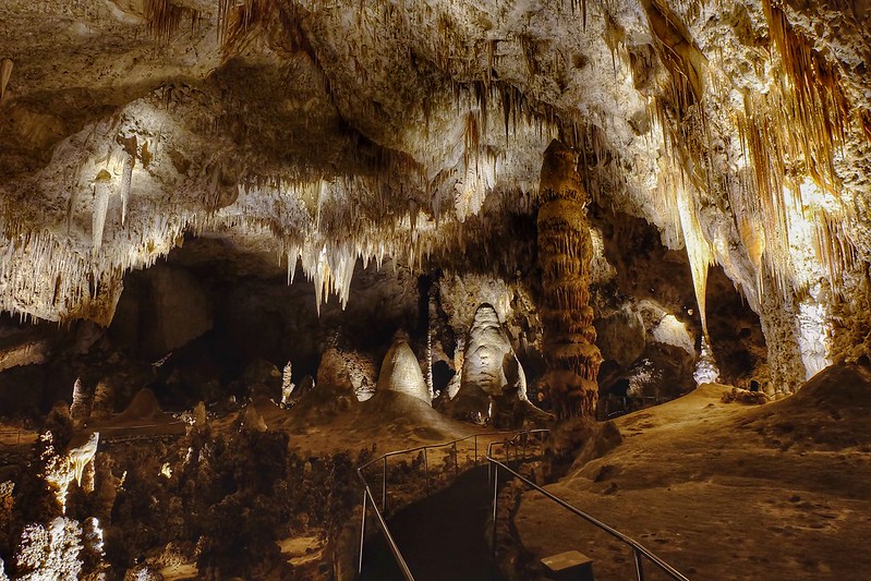 The Big Room is the largest single cave chamber by volume in North America and the main highlight of Carlsbad Caverns. This enormous space could comfortably house six football fields. It’s adorned with massive stalactites, stalagmites, and a host of other surreal geological formations.